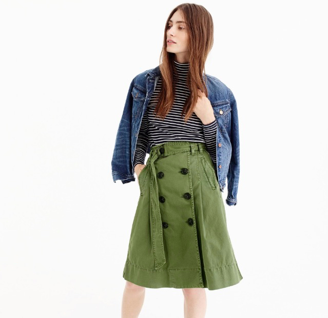 上品なひざ丈スカートでトレンチ風ダブルのボタンも目を惹きます。ベルトはリボンに結んでもかわいいですよね。