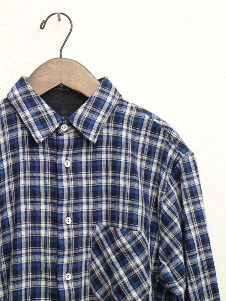 カラーはブルーベースのチェック。 裏パイルではございませんが、ブランド側はビーチシャツと謳っており、吸水性にも優れた高級感あふれるコットンガーゼの接結生地で、柔らかく上品な印象です。