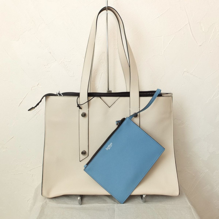 ホワイトのレザーのトートバッグに、ブルーのポーチがアクセントになったデザイン。