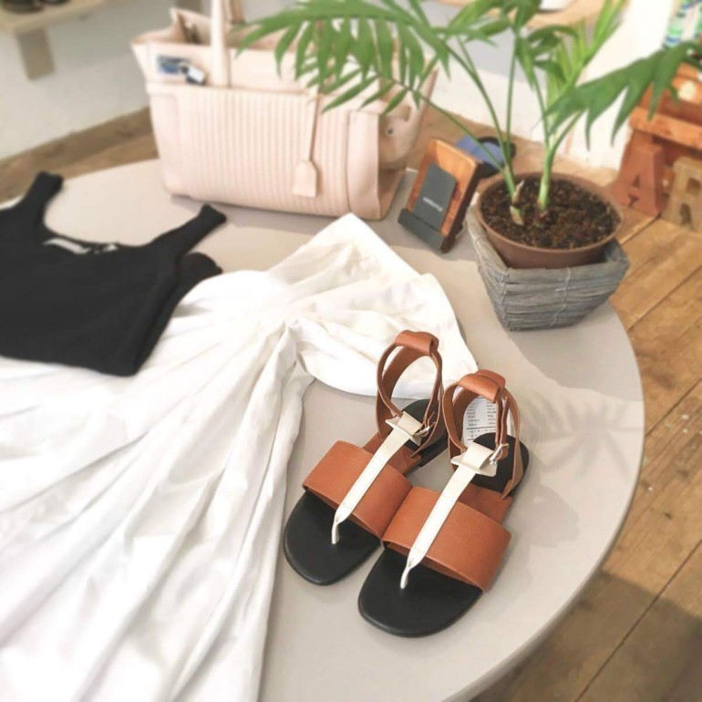 足を包み込んでくれるブラウンのレザーと白くのびたトングの鼻緒が