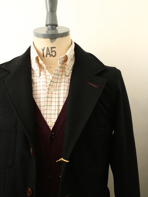 ブラックのジャケットにボタンホールやステッチがボルドー系のブラウンなので