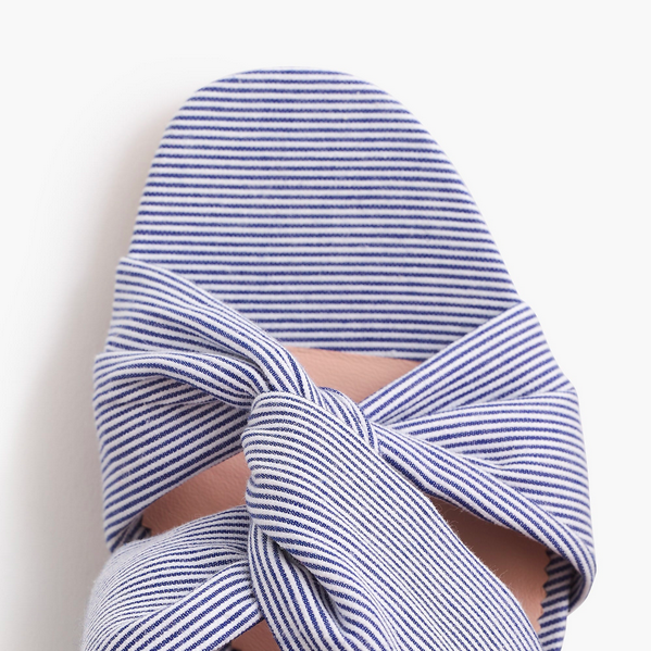 J.CREWから入荷したこちらのサンダルは爽やかで涼しげなサックスブルー×ホワイトのピンストライプ生地を使用しております。