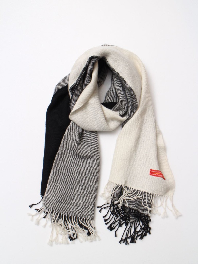 ストールを大きく四分割にしてオフホワイトの部分とブラックの部分とミックスの部分は縦と横の織り方を変えて変化をつけております。