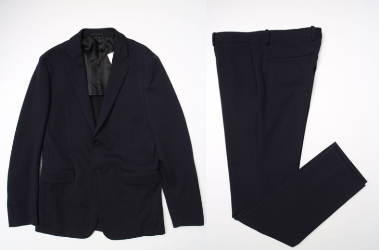 素材はウール混のような少し光沢のあるダークネイビーのヘリンボーン。