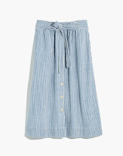 7月になりましたね。そして昨日までの雨がウソみたいに今日はいいお天気!! そんな今日は涼しげなスカートをご紹介いたします。 久々登場のメイドウェルから入荷したのはホワイト×インディゴストライプのミディ丈スカート。