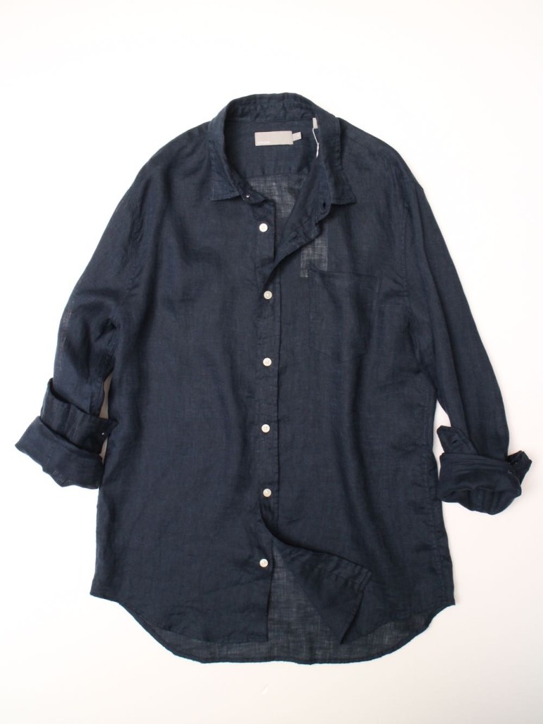 秋口にかけて使えるネイビーのリネンシャツが入荷です。