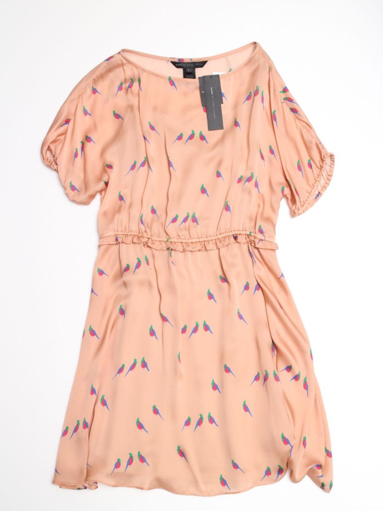シルク100%のバード柄生地をシームレスで贅沢に使ったワンピースです。