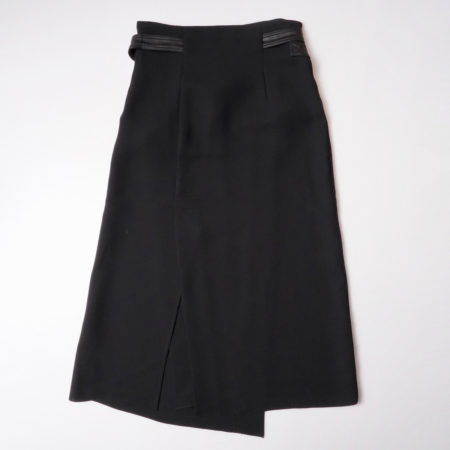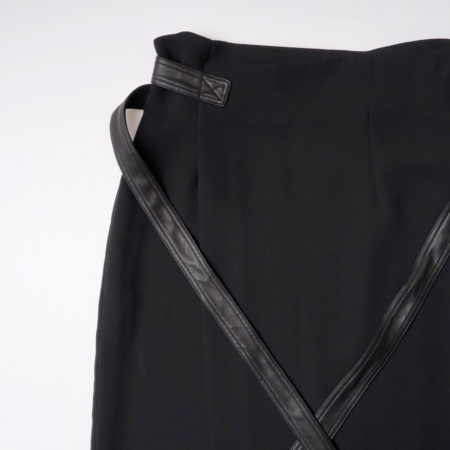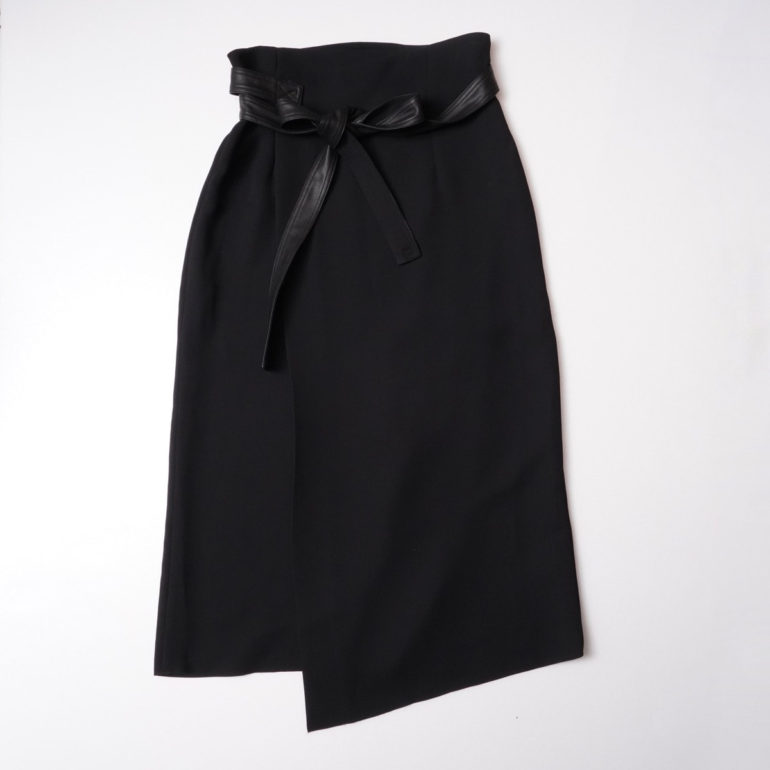 シンセティックレザーのベルトが目を惹くラップスカート。