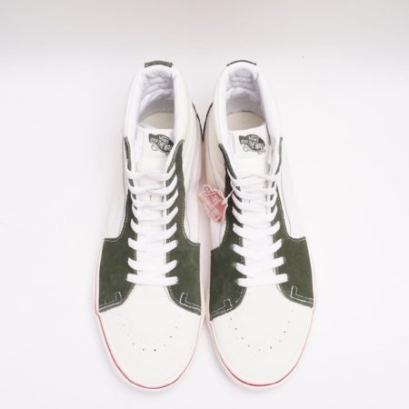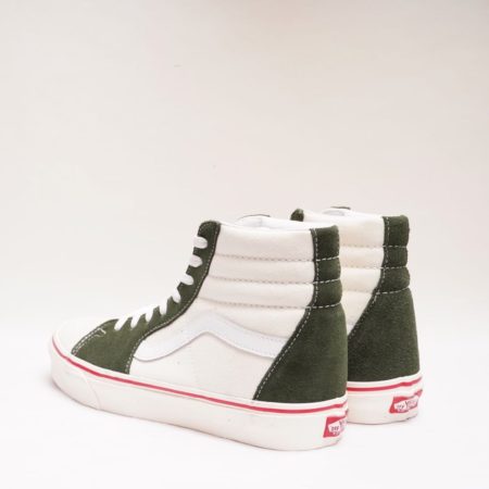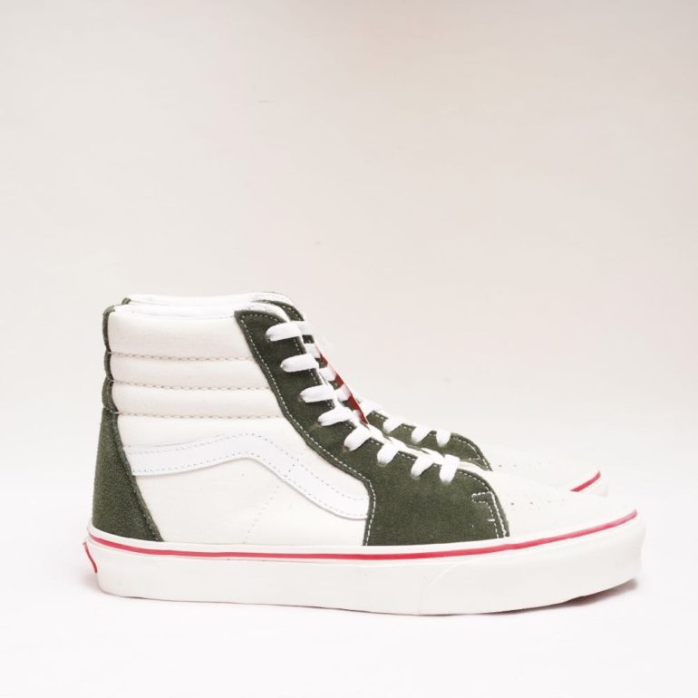 オリーブグリーンのスエードとオフ白のキャンバス、そしてアウトソールの赤ラインが際立つSK8 Hiが入荷しました。
