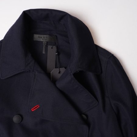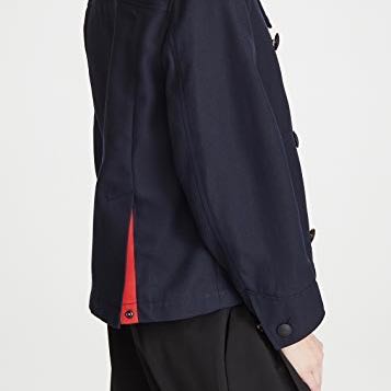 大きな襟や目を惹くレッドのボタンホール、こだわりのボタン、裏に使われているレッドのパイピング、サイドベンツのスナップボタンを外した時に見えるレッドカラー。