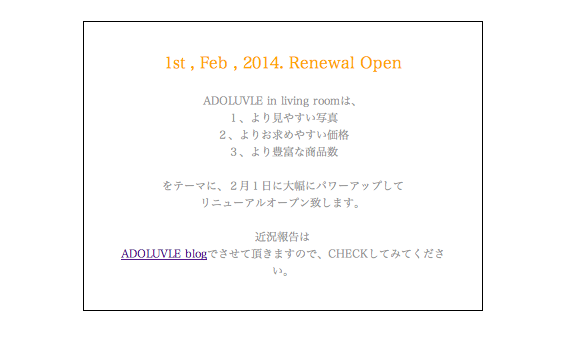 さらに当社Web ShopであるAdoluvle in Livingがリニューアルのため、今月いっぱい工事に入らせて頂きます。