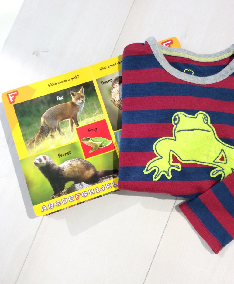 カエル型にカットしたフェルトをアップリケした、なかなか凝ったデザインです。