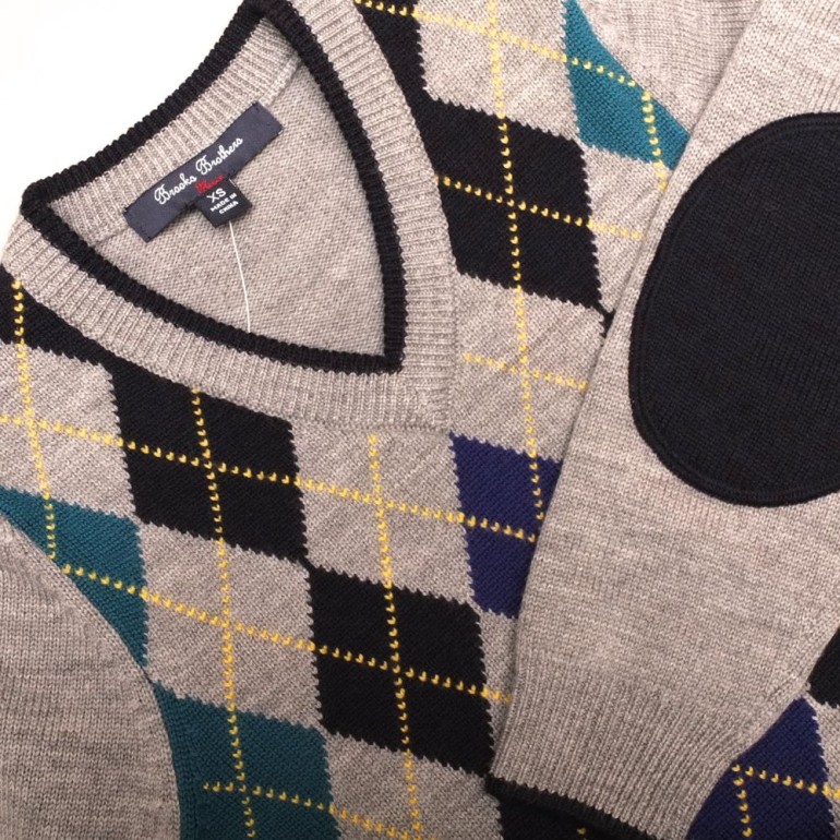 こちらはアーガイル柄のVネックニットで、よく見るとエルボーパッチがついております。