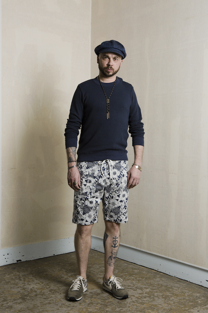 サスペンダーボタン付きシャンブレー素材のパンツ。 これも涼しげです!